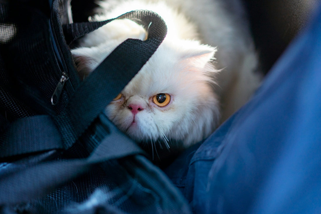 Lightly spray a calming spray like Feliway inside the carrier to help ease your cat’s anxiety, and add comfort items like a favorite toy or an old shirt that carries your scent. Keep the car at a comfortably cool temperature, and partially cover the carrier with a light towel, blanket, or jacket. This creates a dark, enclosed space where your cat can hide if they want to, while still allowing for proper airflow.